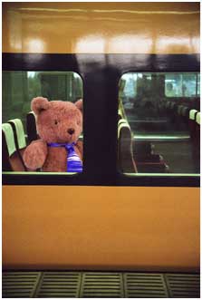 The bears walked quickly to the tram stop and had hardly arrived there when the tram came around the corner. They boarded and each bear found a seat at a window. Theodore enjoyed looking at the city as they went along and soon the first train lines and trains could be seen heading for the station. "I had almost forgotten that a train is so long. The engine has to be very big and strong to pull all those coaches," he thought. Ferdinand Bear held the little bag of cookies tightly to make sure it did not slip off his lap. Hernando and Merlena were sitting next to each other and did not say much. Theodore guessed they were feeling rather sad that their cousin was leaving again. The station was a beautiful big building with many arched entrances for the trains and another arched entrance for the travellers. The bears got off the tram and Merlena Bear said, "I have been here often before and know my way to the ticket office. Follow me and don't get lost. It will be busy inside there."